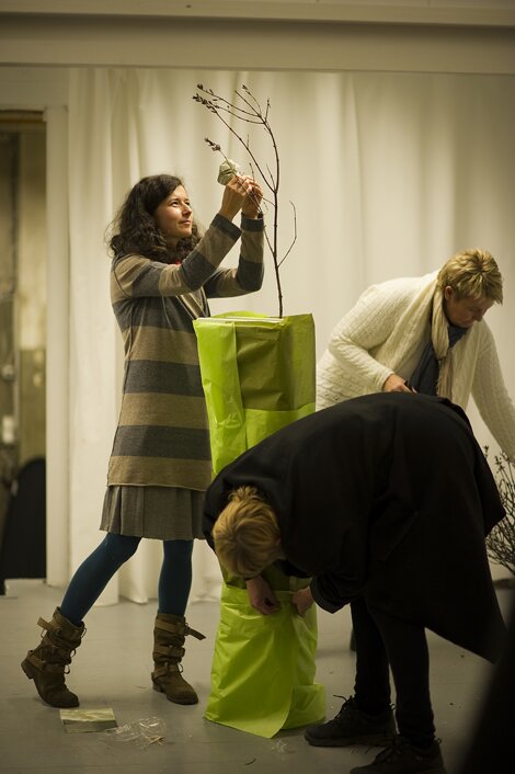 Siv Engen Heimdahl fra Vea, Statens fagskole for gartnere og blomsterdekoratører ledet det første verksted innen Årstidsstrategier. Joanna Mikulska monterer den første greina (foto: Christoffer Horsfjord Nilsen).
